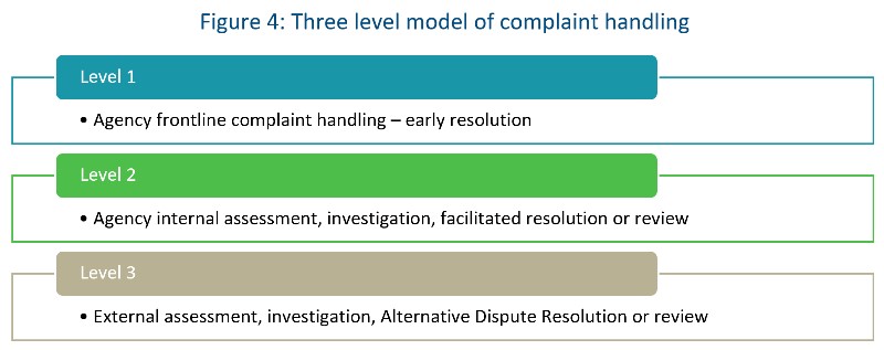 The IGTO is committed to independent assurance and investigation of the taxation actions and decisions in complaints and disputes that are raised with us by the community. Best practice dictates that an effective complaint management system incorporates three levels of complaint management.[2]AS10002:2022 – Guidelines for complaint management in organizations – Appendix H – Three level model of complaint handling.