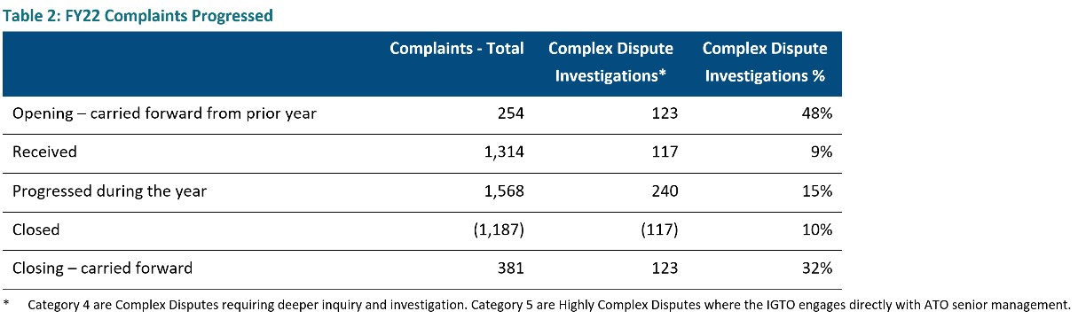Karen Payne, the Inspector General of Taxation and Taxation Ombudsman has released the FY22 Annual Report. “I am pleased to announce that the Annual Report for the Office of the Inspector-General of Taxation and Taxation Ombudsman (IGTO) is now available[1]The Annual Report was tabled in the Australian Parliament by the Assistant Treasurer and Minister for Financial Services the Hon. Stephen Jones MP on Thursday 27 October 2022.. The report includes details on our performance and achievements during the financial year ended 30 June 2022 (FY22) and reports. It also provides an accountability overview detailing the ways in which we have assisted the community and helped to improve taxation administration in Australia.”